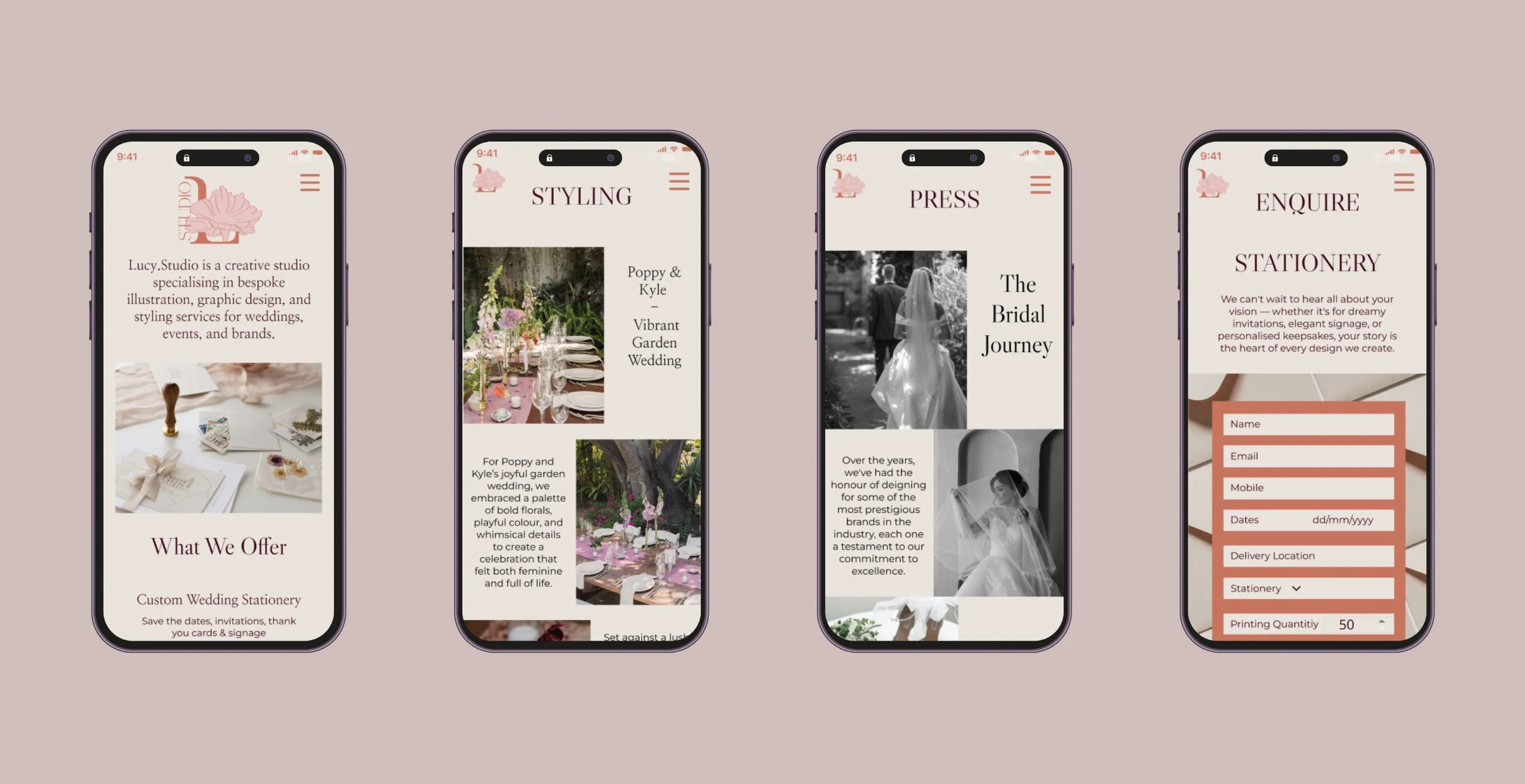 A complete brand identity and user interface project developed for Lucy.Studio, a creative platform offering stationery, event styling, and custom bespoke event packages. Designed in Figma, the app concept focuses on a seamless and visually elevated user experience that reflects the brand’s elegant, creative personality.