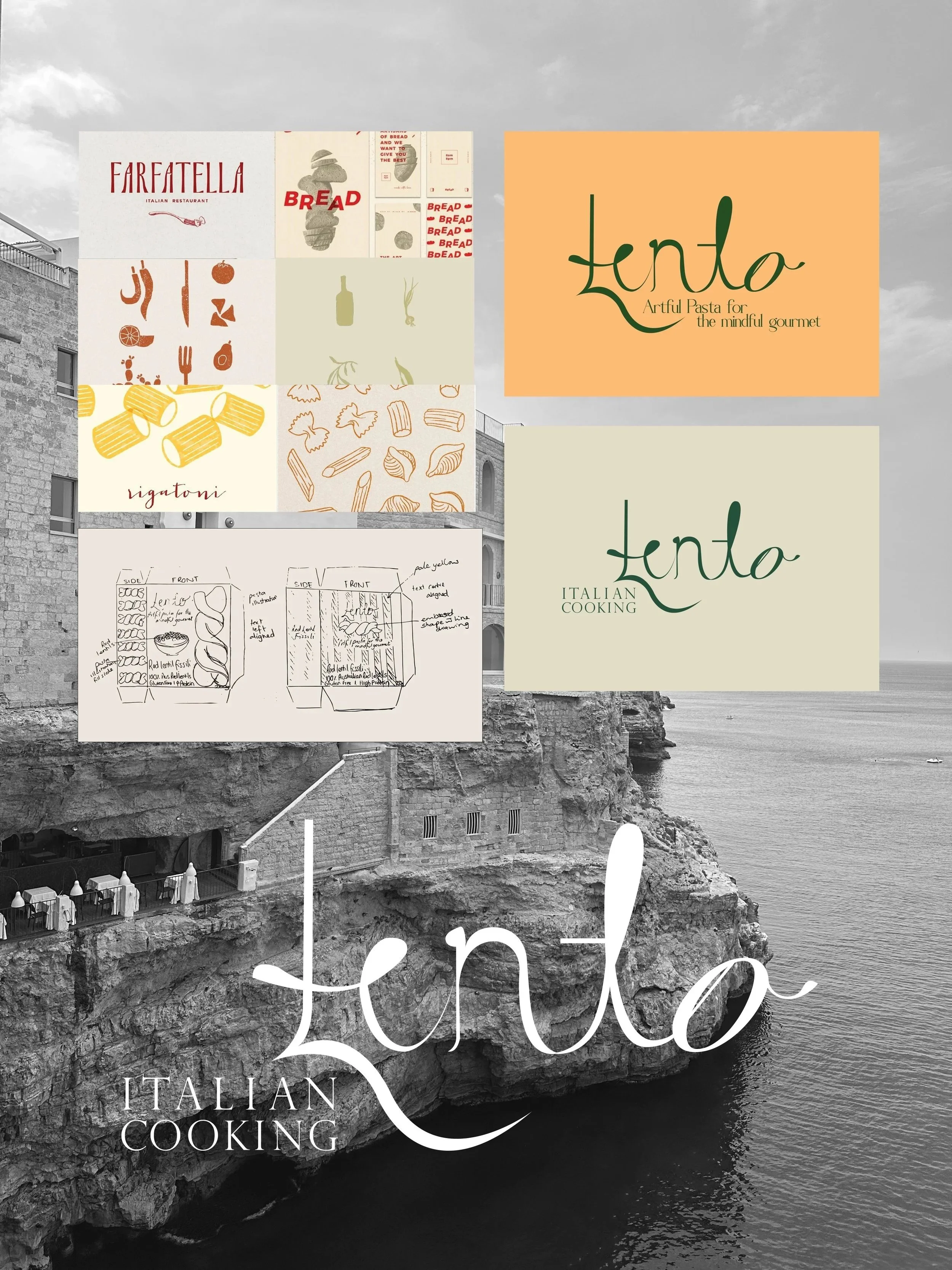 The outcome explores typography, illustration and visual identity, developed into a cohesive packaging system with strong shelf presence and clear information hierarchy. From initial concepts through to 3D packaging and print-ready dielines, the design balances a contemporary aesthetic with an artisanal, Italian-inspired feel.